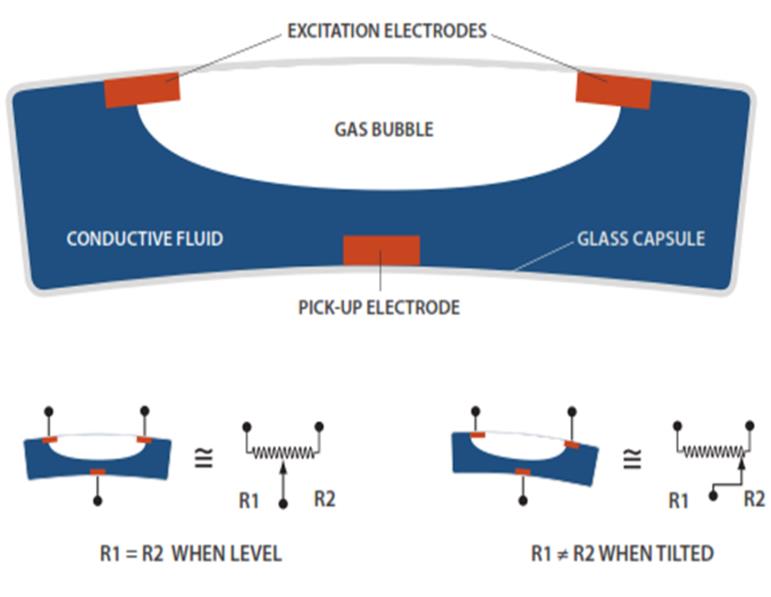The sensors in Jewell Instruments Geotech/Tech tiltmeters are known as electrolytic tilt sensors, a type of electronic spirit level comprised of a glass case and containing a conductive liquid (electrolyte), an air bubble, and platinum electrodes. As the sensor tilts, the wetted area of each excitation electrode increases or decreases, depending on the tilt direction. This change causes the electrical resistance between the central pickup electrode and each excitation electrode to rise or fall. It is these resistance changes that are sensed by the tiltmeter electronics, which convert them to precise measurements of the magnitude and direction of tilt.