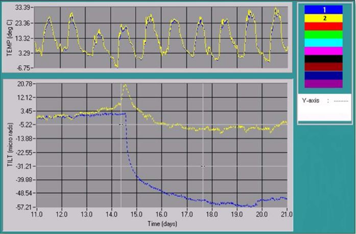 The graph to the right presents a real-life example of thermoelastic deformation of a thin-arch concrete dam. The high-gain Jewell Instruments electrolytic tiltmeter is installed in a gallery inside the dam, where temperatures do not cycle on a daily basis because of the insulating effect of the thick concrete. The plot shows gallery temperatures and raw (uncompensated) upstream-downstream tilting of the dam during a two-week period in early October 1993. Although temperatures do not vary, the real tilt angle fluctuates by 15 microradians daily as the result of daily heating and cooling of the downstream face of the dam a few meters away.