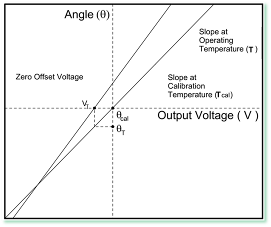 The temperature change can also shift the zero crossing of the calibration line in the absence of any real tilt of the structure to which the tiltmeter is attached. In the graph, the zero offset voltage is VT which leads to an apparent tilt angle of q = ScalVT at temperature T. The zero shift is therefore q – q cal or ScalVT – cal. The zero shift per unit temperature change is defined as the temperature coefficient of zero shift, Kz.