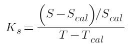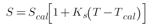 The change of slope per unit temperature change is the temperature coefficient of scale factor where Scal is the scale factor at the calibration temperature Tcal, and S is the scale factor at a different temperature T.