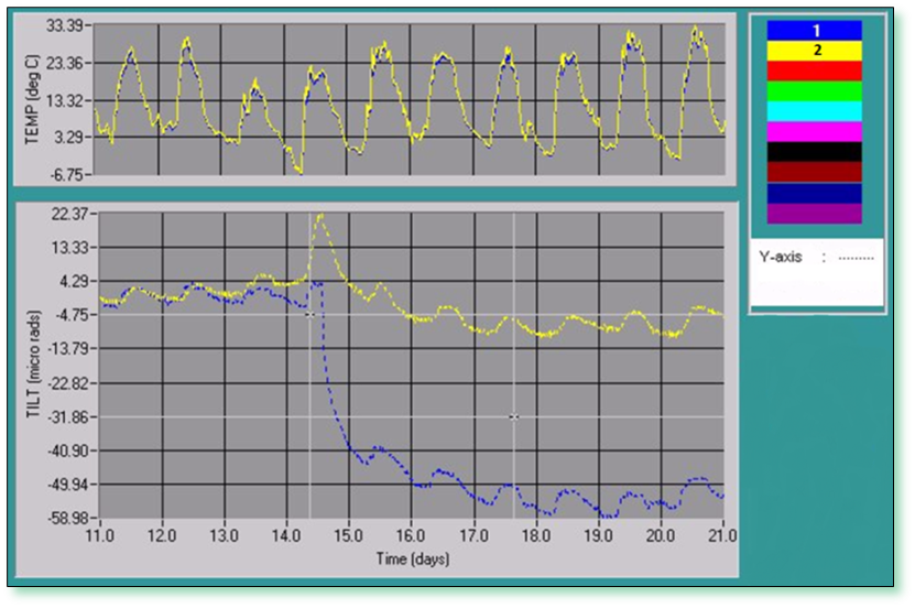 The graphs below display 10 days of data for two high-gain tiltmeters with a resolution of 1 microradian (Tiltmeter 1 is blue and Tiltmeter 2 is yellow).