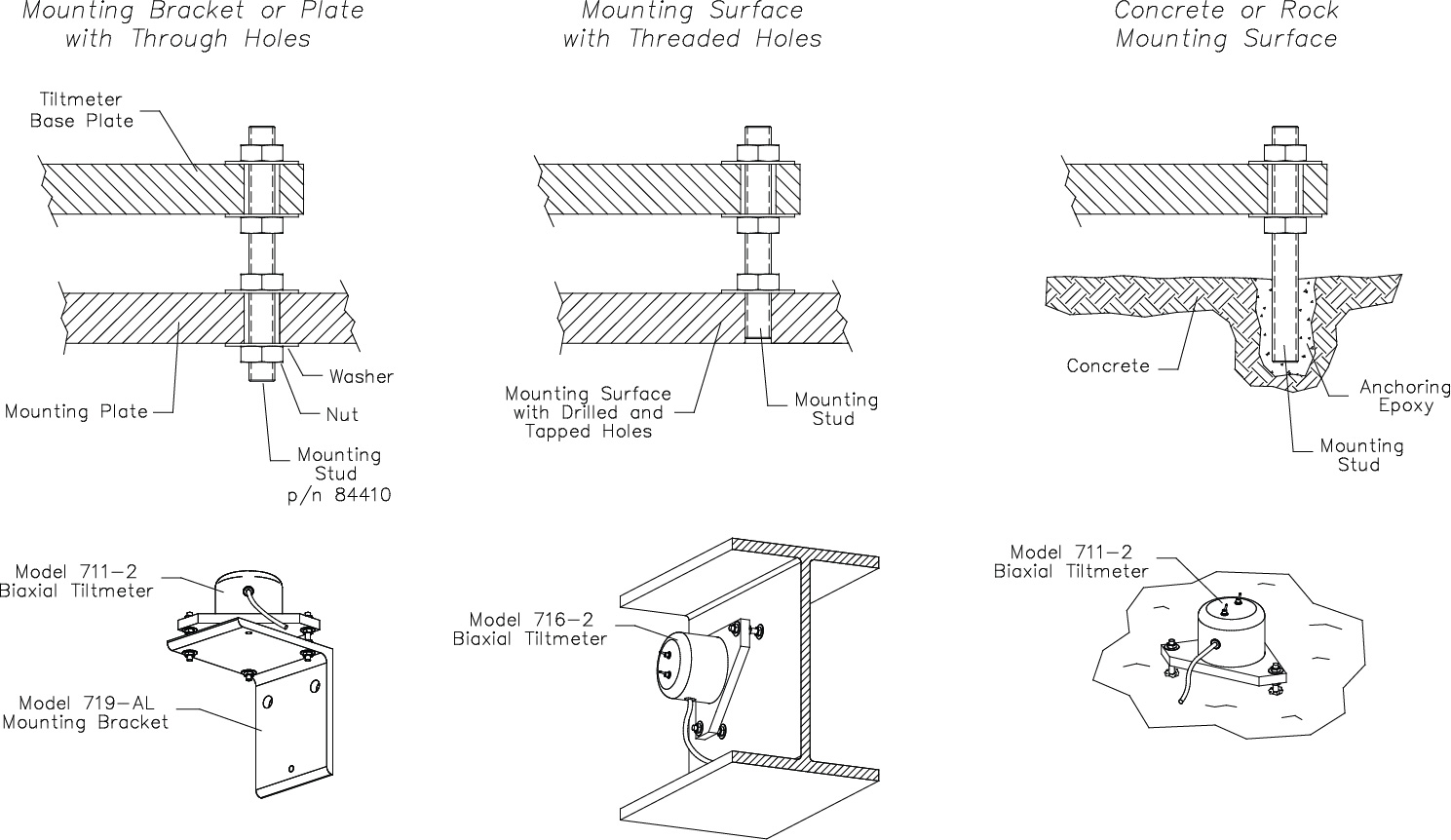 The following drawing illustrates installation techniques for 700– Series Biaxial Tiltmeters (Models 711-2, 716-2). Please contact us with questions or for additional details.